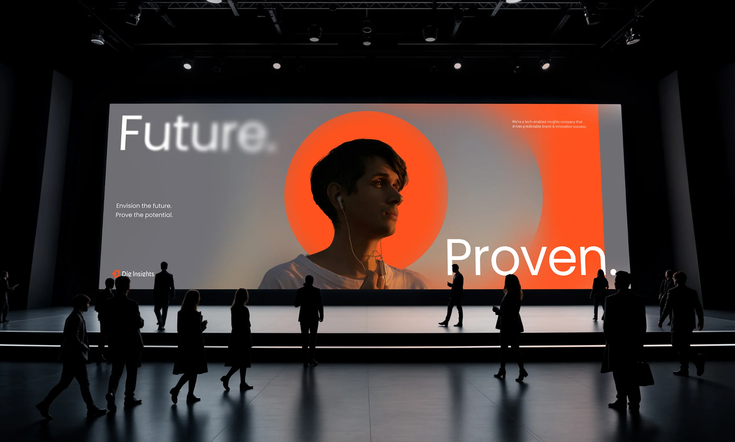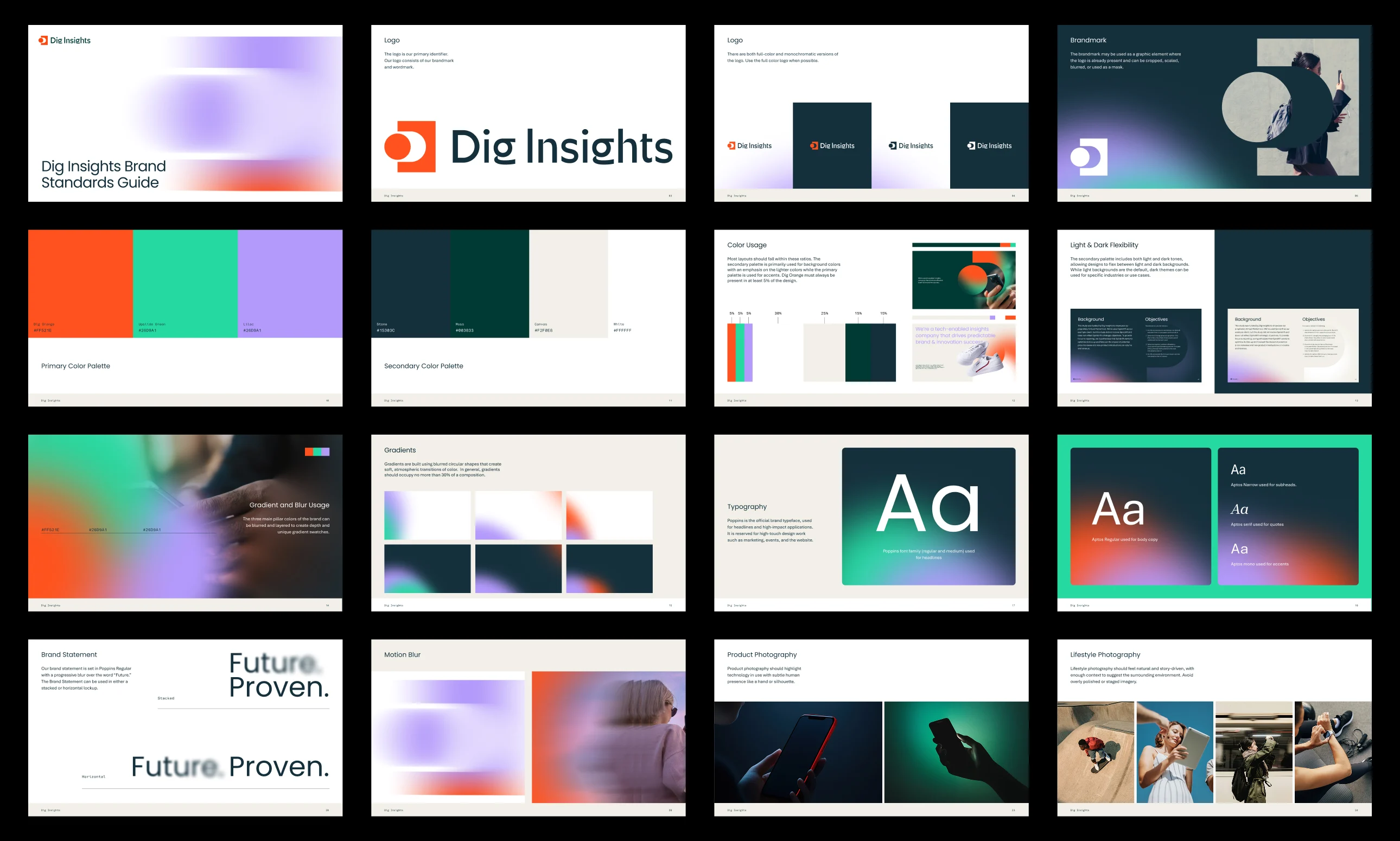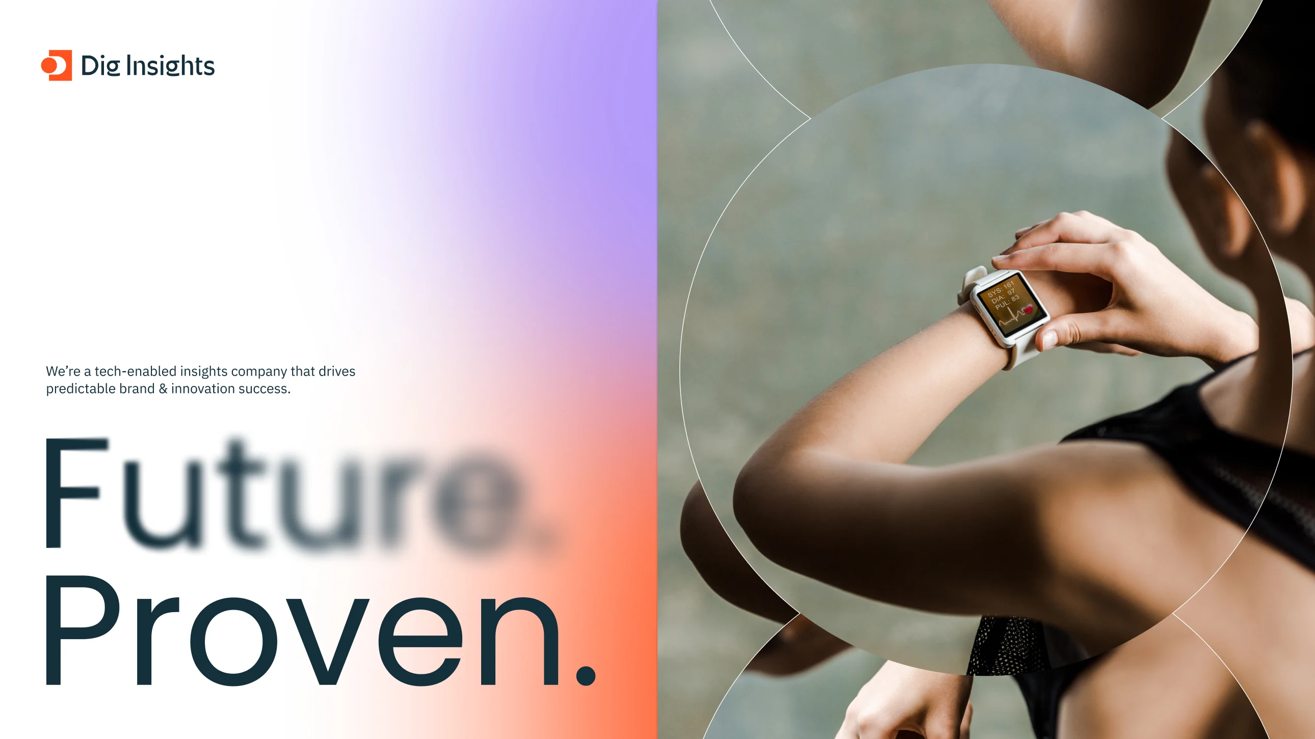 We built a bold, scalable system that unifies Dig, Ebco, OneCliq, and Upsiide under a single, cohesive brand. A vibrant color system, modern typography, and authentic photography are layered with blur and gradient treatments, the visual cues that reflect the intersection of human insight and advanced technology powering their work. Anchored by the statement “Future. Proven.” the system positions Dig as a confident, forward-looking insights partner to brands worldwide.